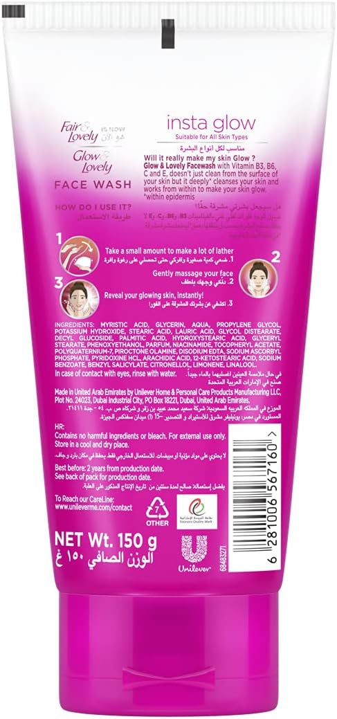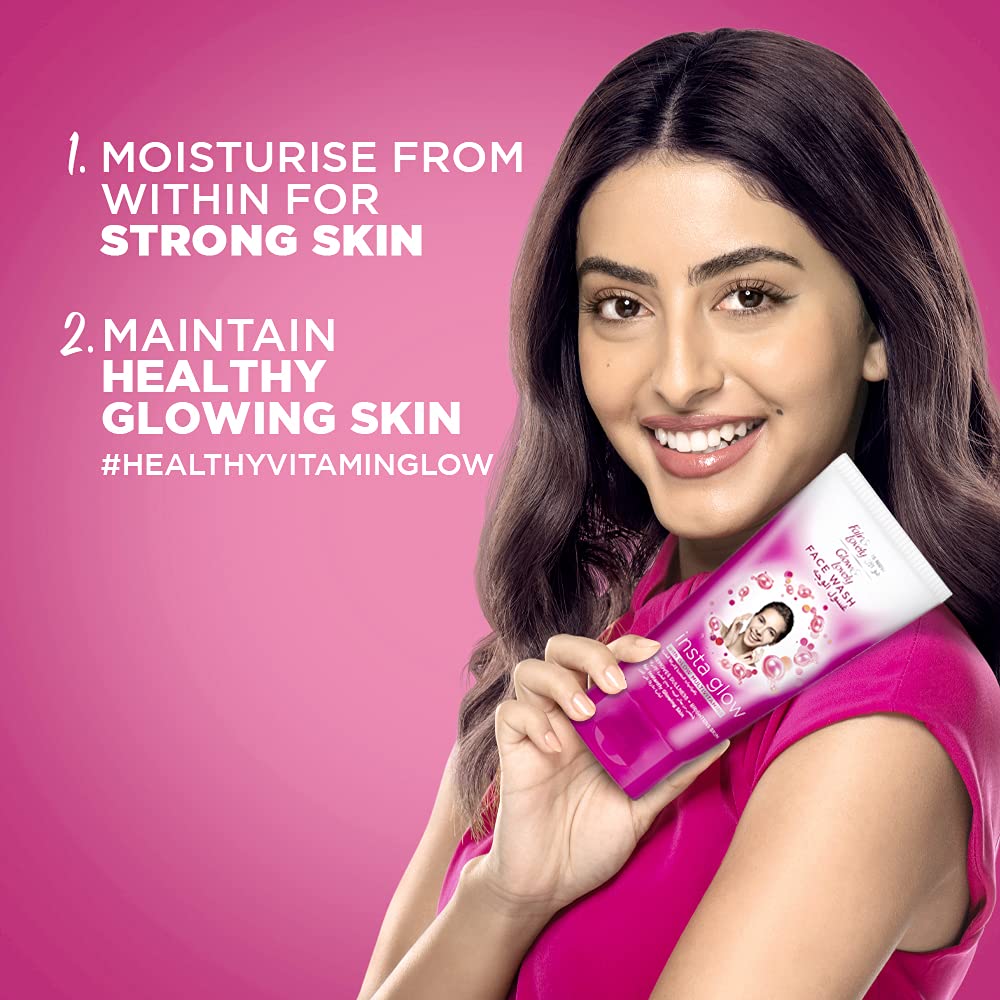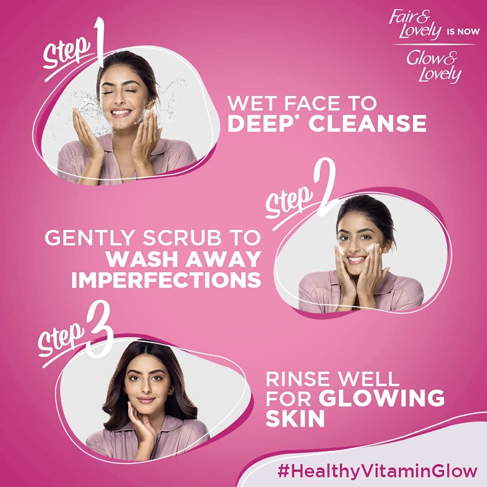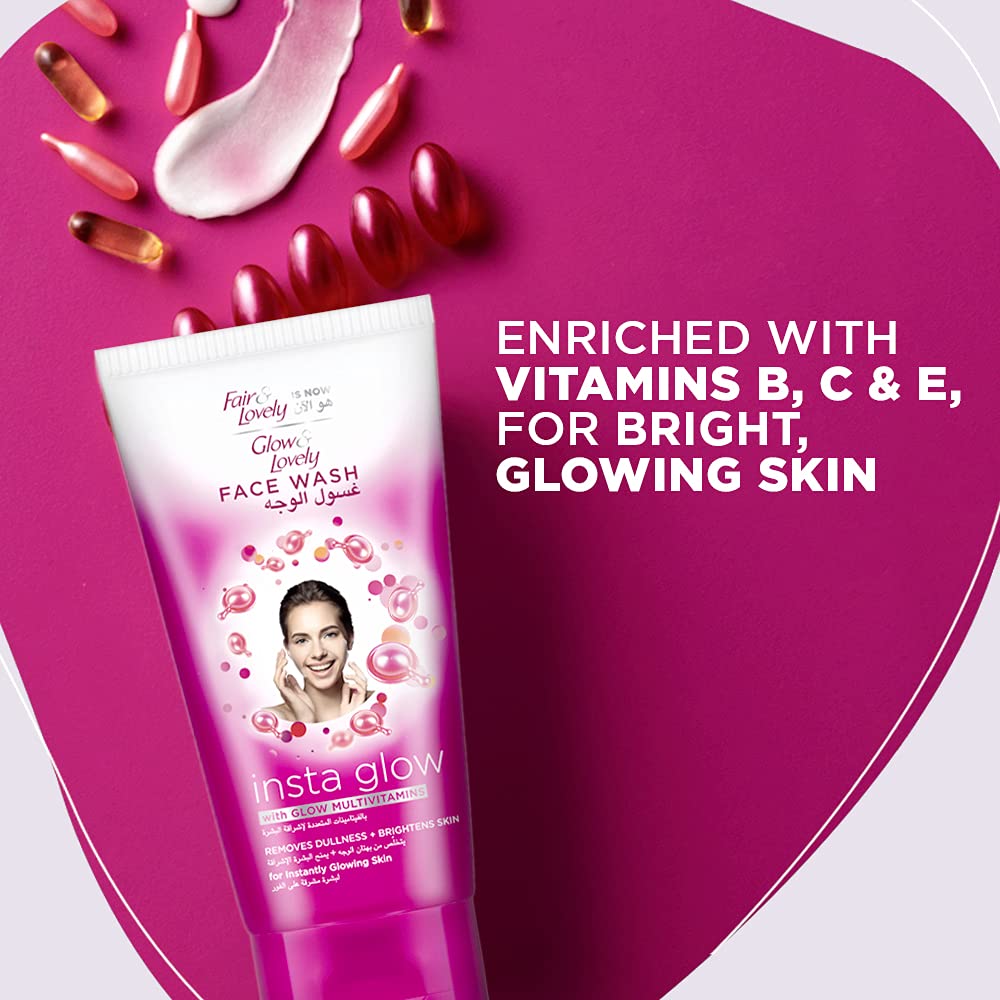 - Glow & Lovely Instant Glow Face wash with Vitamin B3, B6, C and E, doesn’t just clean from the surface of your skin but it deeply* cleanses your skin and works from within to make your face glow.